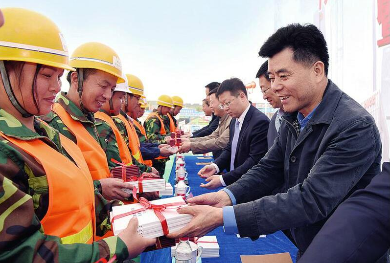 4月20日,在陕西省建设系统农民工入会暨服务工作现场会上,省总工会常务副主席张仲茜为入会农民工代表颁发会员证及劳动保障类书籍。