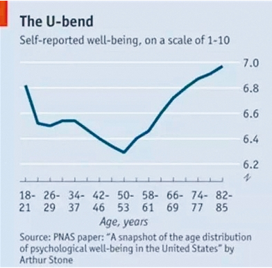 据了解,俄罗斯的研究者调查了来自80多个国家的200多万人后发现,在不同国家、不同人身上,幸福感随年龄变化的走势惊人地相似,均呈现“U”型曲线。性别、婚否、贫富、有无子女、职位与收入变化等因素都不会影响幸福感曲线的整体趋势。