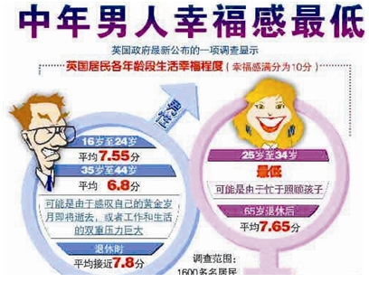 “中年危机确确实实是存在的。”王薇华说。英国与美国社会学家研究表明,人一生的幸福感呈现“U”型曲线,年轻与年老时最快乐,中年感觉最不幸,“谷底”在44岁左右,也被称为“中年剪刀差”。