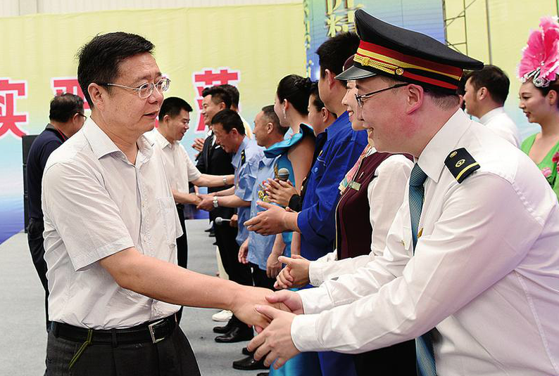 开幕式结束后,省总工会主席白阿莹(左一)接见西安铁路局职工创新大讲堂展演职工代表。记者 刘强 摄
