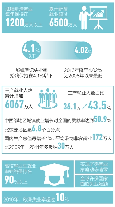 这是“饭碗”越端越牢的5年:城镇登记失业率始终保持在4.1%以下,2016年降至4.02%,为2008年国际金融危机以来最低。