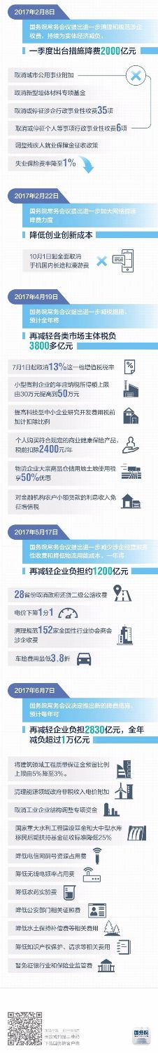 “全年为企业减税降费力争达到1万亿元。”今年3月份的两会记者会上,李克强总理掷地有声作出承诺。上半年以来,总理已经先后5次在国务院常务会部署减税降费工作,每一次都有实实在在减税降费实招:取消手机国内长途和漫游费、小微企业年应纳税所得额上限由30万元提高到50万元……在这说不完了,中国政府网(微信ID:zhengfu)、国务院客户端已经帮你整理好,一图领取上半年减税降费福利吧。