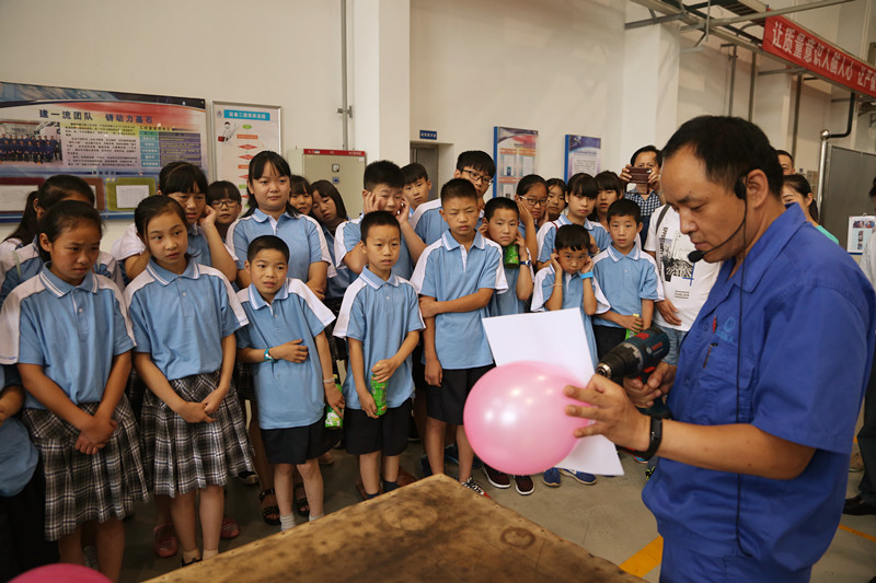 7月5日,在航天西安发动机厂车间,“三秦工匠”杨峰为孩子们表演在气球上给A4纸打孔的绝活。 由陕西省总工会主办的“放飞希望、励志成才”关爱山区少年儿童夏令营开营。此次活动让陕西省总对口帮扶的孩子们走出大山,走进城市、高校和现代企业,让他们拓展视野、增长知识。鲜康 摄 据《工人日报》 转载请注明: 陕西省总工会 » “三秦工匠”为山区儿童展绝活 赞 (0)