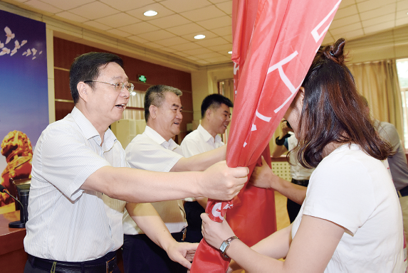省总工会主席白阿莹(左一) 等领导向服务农民工法治宣传分队代表授旗。(记者 刘强 摄)