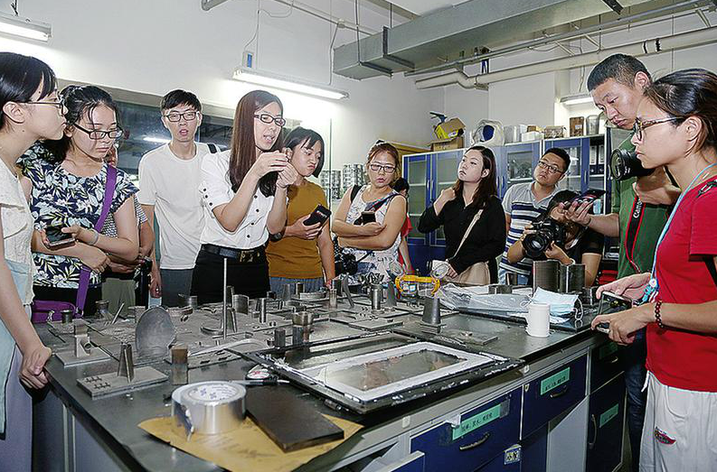 新闻采访团成员参观西安交大曲江校区机械制造系统工程国家重点实验室。(记者 鲜康 摄)