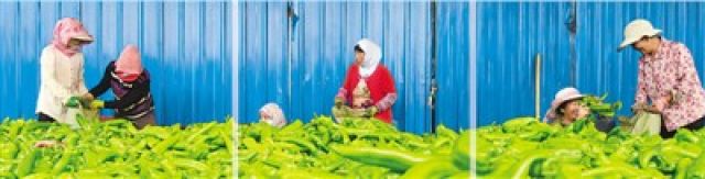↑宁夏隆德县联财镇联合村设施蔬菜种植基地,农户将刚刚收获的青椒装袋。近年来,该县通过给予资金补贴、培育专业合作组织、发展壮大村级集体经济、创新金融扶持等举措,鼓励带动贫困户大力发展冷凉及设施蔬菜种植,以实现脱贫增收。隋先凯摄(新华社发)