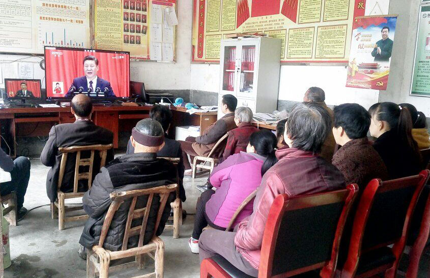 10月18日,陕西工人报社对口扶贫村——安康市汉滨区谭坝镇草庙村的村民们早早来到村委会,认真观看十九大开幕会盛况。 (记者 刘西锋 通讯员 王宗荣 摄)