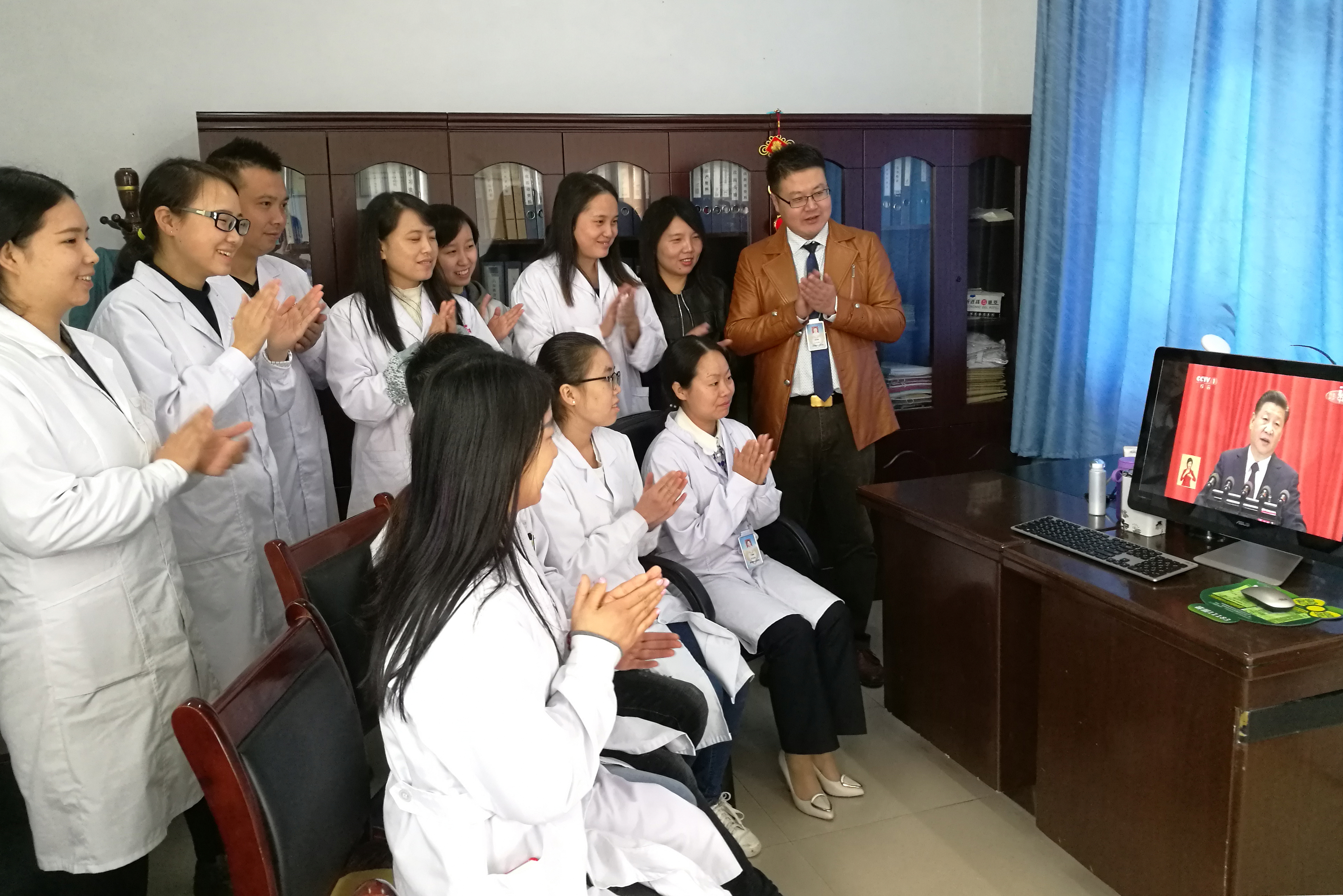 10月18日上午9时,城固县原公镇中心卫生院医护人员在电脑前,认真收看党的十九大开幕会。(通讯员 陈耀芊 李秀丽 摄)