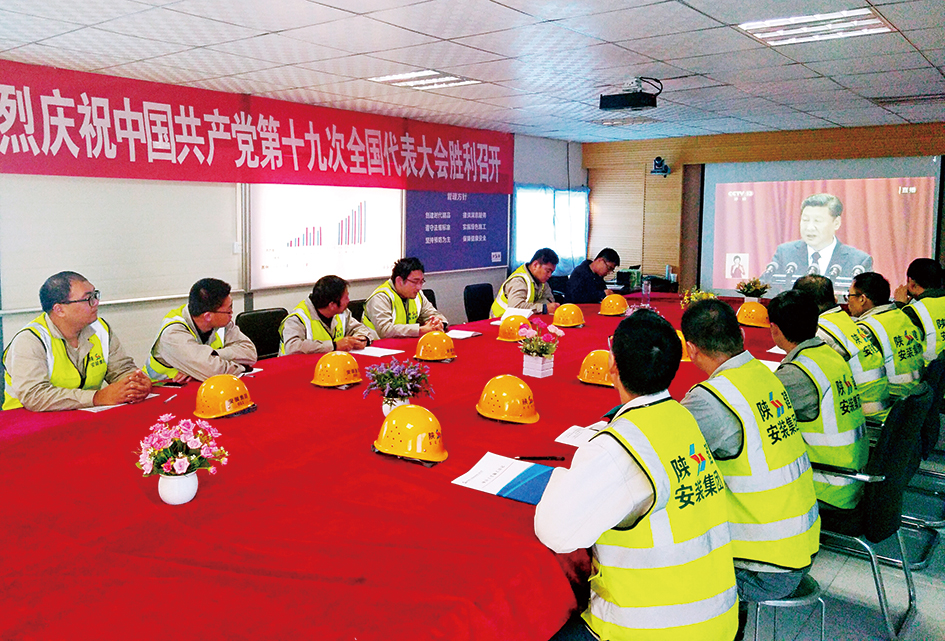 10月18日,陕建安装集团海内外千余名党员职工,共同收看十九大开幕会盛况。(通讯员 杨首民 摄)