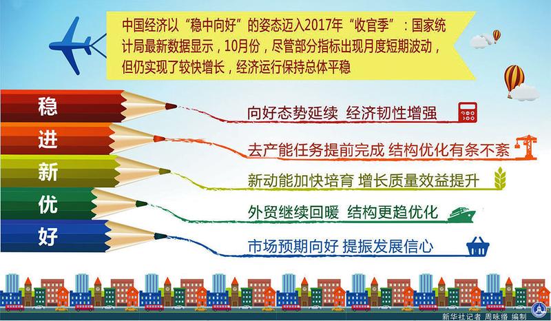 中国经济以“稳中向好”的姿态迈入2017年“收官季”:国家统计局最新数据显示,10月份,尽管部分指标出现月度短期波动,但仍实现了较快增长,经济运行保持总体平稳。