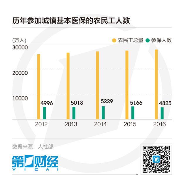 人力资源和社会保障部(下称“人社部”)的统计公报显示,2016年末,参加城镇基本医疗保险的农民工人数为 4825 万人,比上年末减少 340万人。与此相应的,绝大部分农民工在户籍地参加新农合,然而,新农合的保障水平和便携性都难以适应农民工的特征。