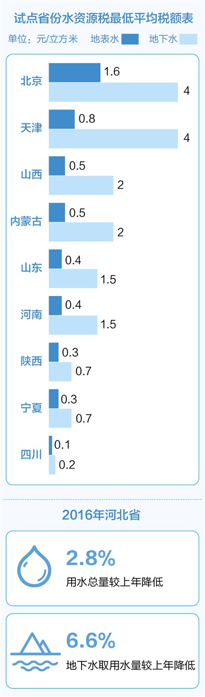 《实施办法》明确试点省份最低平均税额为:地表水每立方米0.1—1.6元、地下水每立方米0.2—4元,其中北京的地表水和地下水税额为试点省份中最高,试点省份可根据实际情况上调税额。