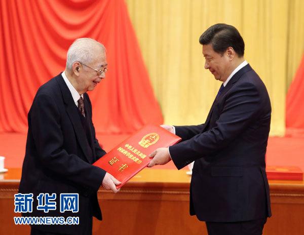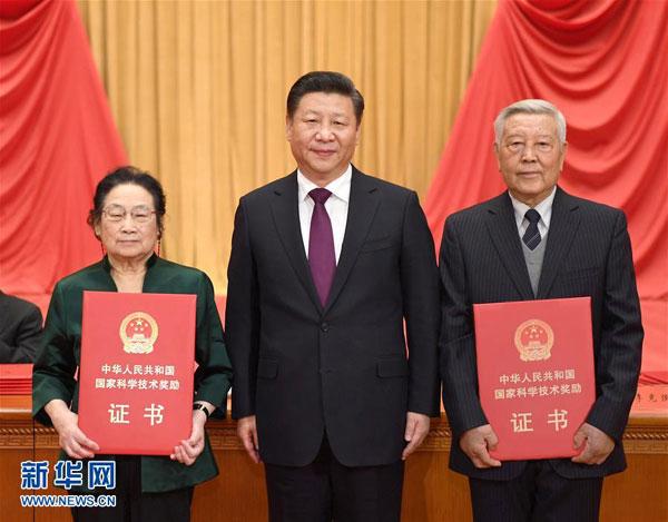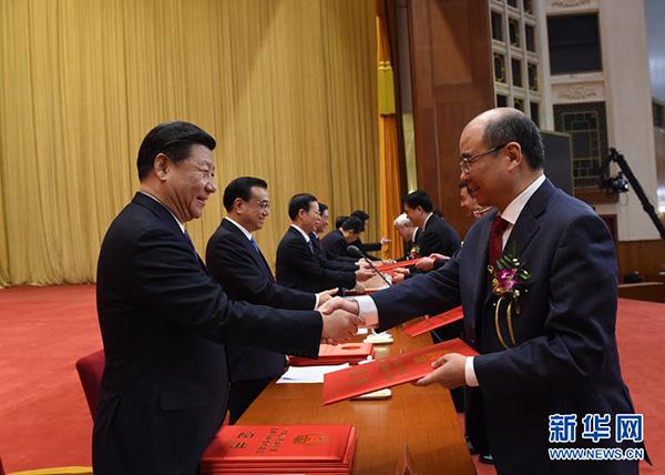 雄壮的音乐声中,习近平站在国家科学技术奖励大会的颁奖台上,将红彤彤的证书,亲手递交到王泽山、侯云德两位院士手中。