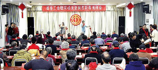 离退休第三党支部书记汪成安代表离退休老同志在团拜会上发言。他首先对省总工会近年来取得的显著成绩表示欣慰。衷心感谢省总领导对老干部工作的重视、关心、支持。特别对老同志在政治上关心、学习上重视、生活上体贴、待遇上落实、福利上争取,同时在服务管理工作中热情主动、细致周到。他感言,省总工会坚持组织开展形式多样、丰富多彩、有益于老同志身心健康的文体活动,使老同志实现了老有所乐、老有所为。