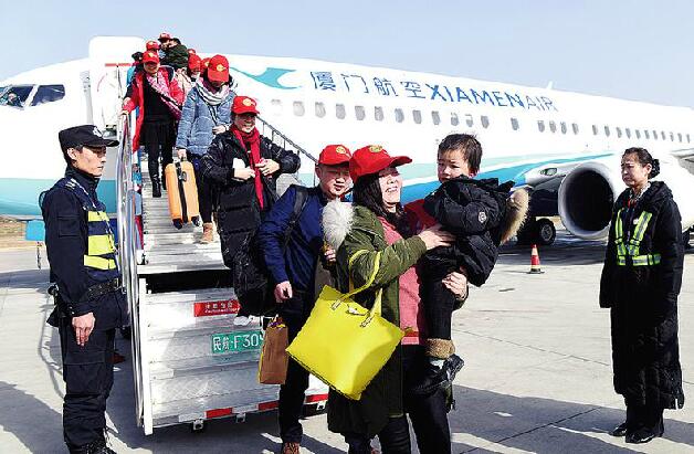 2月10日14时50分,从福州长乐机场飞来的厦航MF8223航班满载146名陕西籍农民工平稳降落在西安咸阳国际机场。航班到达机位后,乘坐包机的农民工受到了机场工作人员的热情欢迎。