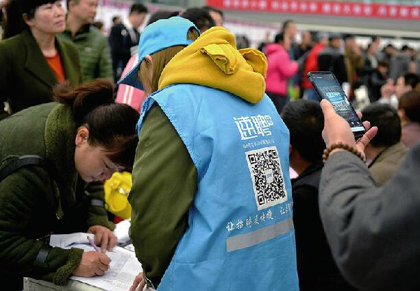 应聘者用手机扫描工作人员衣服上的二维码。(记者 郭玉军 摄)