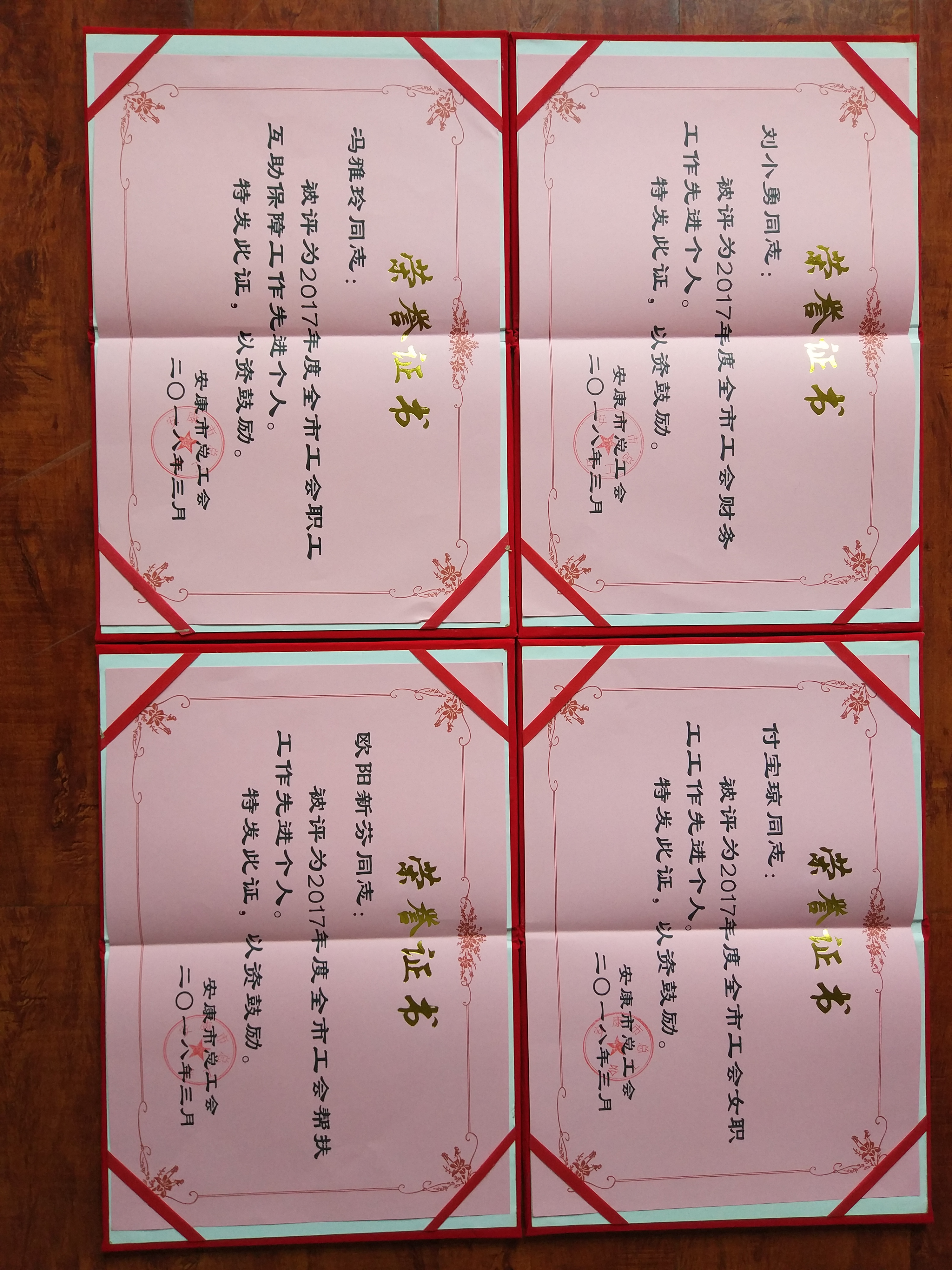 日前,从安康市总工会召开的三届六次全委会上传来喜讯,旬阳县总工会获得全市工会组织工作先进集体、宣传工作先进集体、调研工作先进集体三项殊荣,职工刘小勇、付宝琼、冯雅玲、欧阳新芬四位职工分别荣获全市工会财务工作先进个人、女职工工作先进个人、互助保障工作先进个人、工会帮扶工作先进个人荣誉称号。