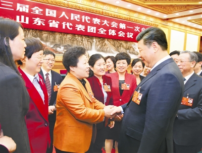 3月8日,中共中央总书记、国家主席、中央军委主席习近平参加十三届全国人大一次会议山东代表团的审议。在“三八”国际劳动妇女节到来之际,习近平代表党中央,向参加全国两会的女代表、女委员、女工作人员,向全国各族各界妇女同胞,致以节日的祝贺和诚挚的祝福。记者 姚大伟 摄