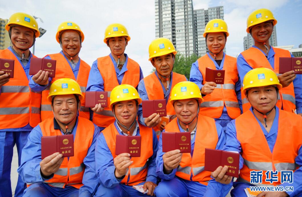 4月20日,来自中建西安幸福林带项目的农民工代表在展示领取的《工会会员证》。