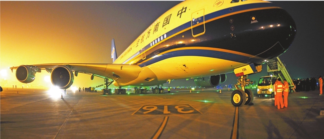 被誉为“空中巨无霸”的南航空中客车A380客机缓缓降落在西安咸阳国际机场。 记者 袁景智摄