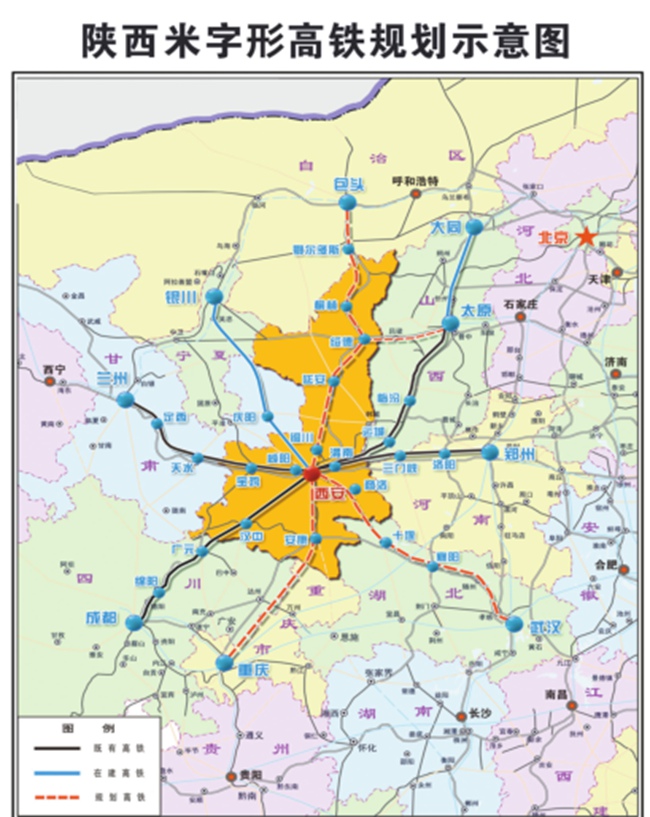 作为我国地理版图的几何中心,陕西是天然的交通枢纽,具有明显的区位优势。在国家规划的“十纵十横”综合运输大通道中有6个、“71118”国家高速公路中有17条、“八纵八横”高铁主通道中有4个都经过陕西,形成了以西安为中心的1环8放射米字形高铁网,2环11放射高速公路网,与周边省份形成了24条国家高速和6条省级高速的运输通道。