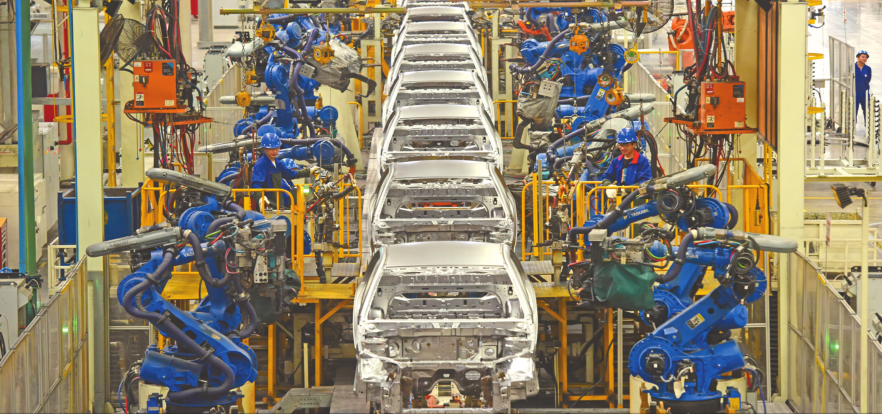 5月3日,工人在比亚迪汽车焊接生产线上作业。 记者 袁景智摄