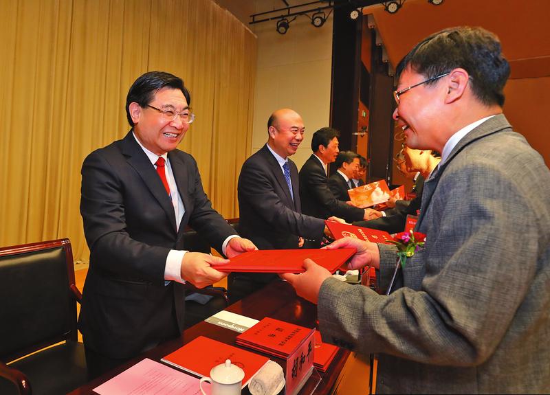 5月22日,全省科学技术奖励大会在西安召开。省委书记胡和平为全省基础研究重大贡献奖获奖者徐宗本院士、陈志南院士颁发奖励证书。省长刘国中讲话。省委常委、西安市委书记王永康,省人大常委会副主任、榆林市委书记戴征社出席。副省长陆治原主持会议并宣读《陕西省人民政府关于2017年度科学技术奖励的决定》。