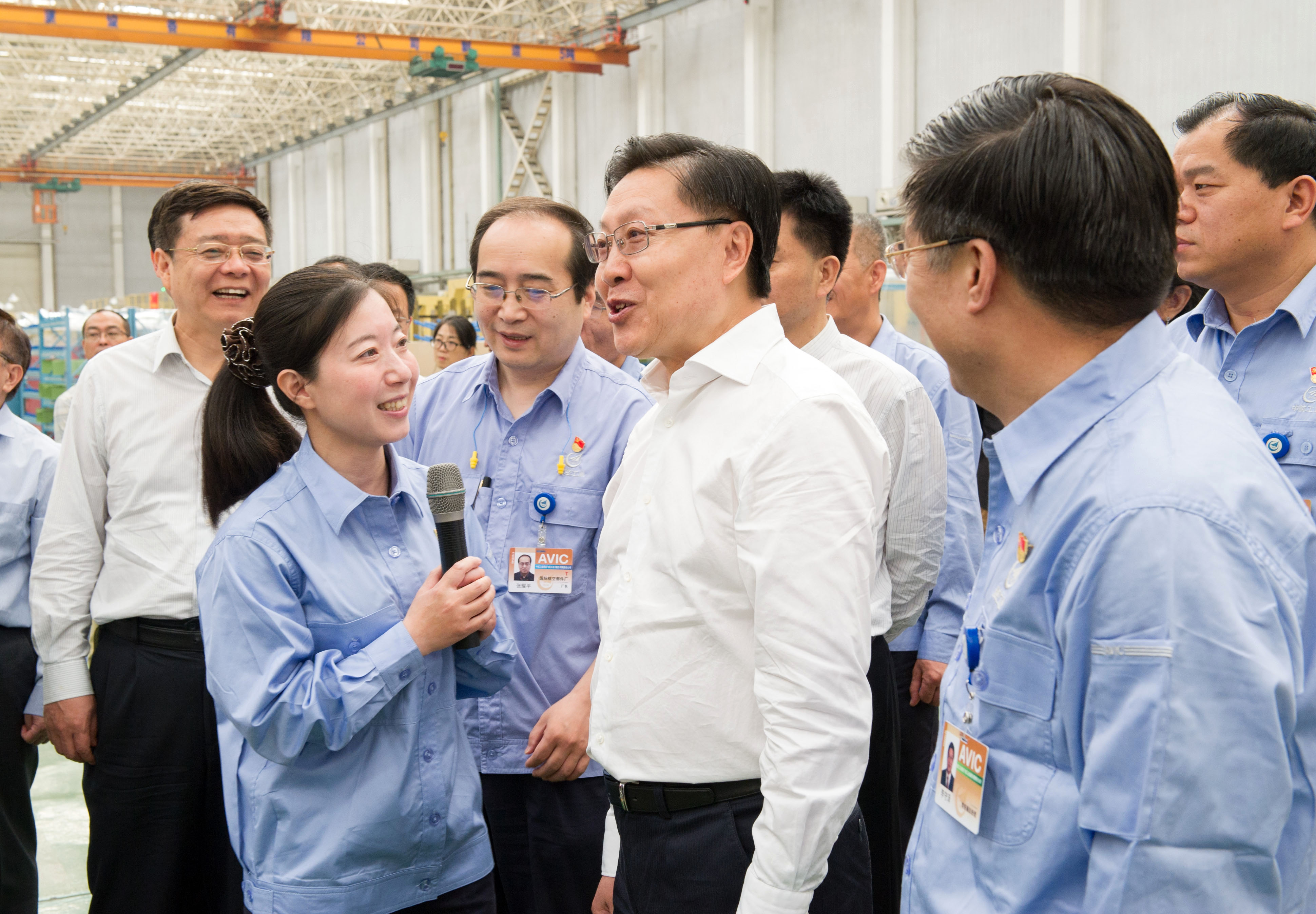 王东明(左四)深入西飞公司生产一线与劳模代表亲切交谈