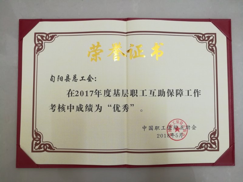 日前,旬阳县总工会荣获2017年度基层职工互助保障工作考核“优秀”单位。