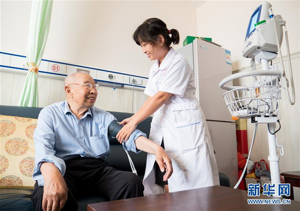 近年来,河北省武邑县积极引导医疗机构开展“医养结合”新型养老服务,让老人乐享幸福晚年。图为县医院医养中心工作人员在养老公寓为老人测量血压。记者朱旭东摄