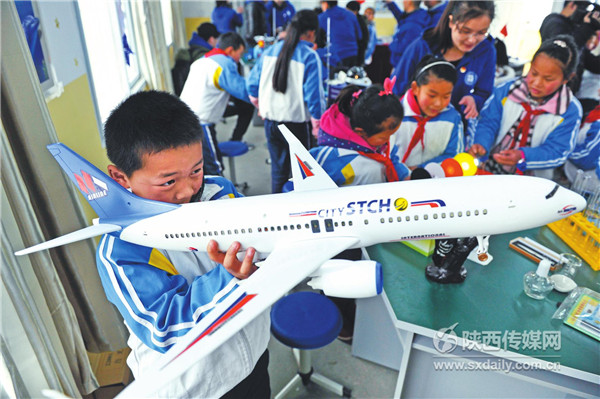 在商洛市镇安县熨斗九年制学校科技小屋内,学生正在感受飞机模型、热能电能转换仪、星空仪等科学器材带来的魅力和乐趣。 记者 刘强摄