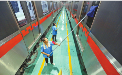 10月1日21时,负责保洁工作的陈方早早来到西安地铁列车检修库,为列车清洁提前做好准备。“安全生产至关重要。在地铁列车检修库,我们也要遵循‘安全第一,预防为主’的工作理念。在每天的保洁作业开始前,我们会将‘禁止动车正在保洁’的安全提示牌挂在车前。在几个小时的忙碌中,我们除了对列车车厢地面进行清洗,还要对车厢内部进行消毒。每名保洁人员按照各自分工,对列车门体、车窗、座位等进行清洁,并对座位及扶手进行消毒,确保车厢环境干净整洁,让广大市民和游客拥有安全、舒适的乘车体验。”陈方介绍说。