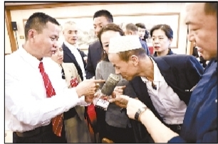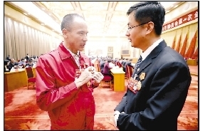 10月25日,同为全国劳模的贾向东代表(图左)在会议间隙询问肉孜麦麦提·巴克代表胸前其中一枚奖章的来历。