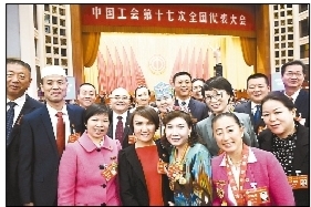 10月24日,中国工会十七大第二次全体会议结束后,部分代表在会场内合影留念。(记者 杨登峰 许之丰 吴凡 王伟伟 摄影报道)