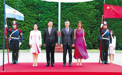 习近平和夫人彭丽媛在马队护卫下前往总统官邸,礼兵在林荫大道两侧列队接受检阅。抵达荣誉广场时,军乐团奏响欢快的进行曲。马克里和夫人阿瓦达上前热情迎接。两国元首夫妇登上检阅台。军乐团奏中国、阿根廷两国国歌。