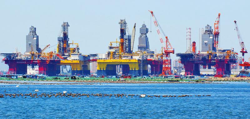 在中集来福士山东烟台建造基地,多座半潜式钻井平台在施工中(2018年6月29日摄)。国家统计局1月21日发布数据显示,2018年我国国内生产总值(GDP)900309亿元,首次突破90万亿元大关。 (唐克摄)