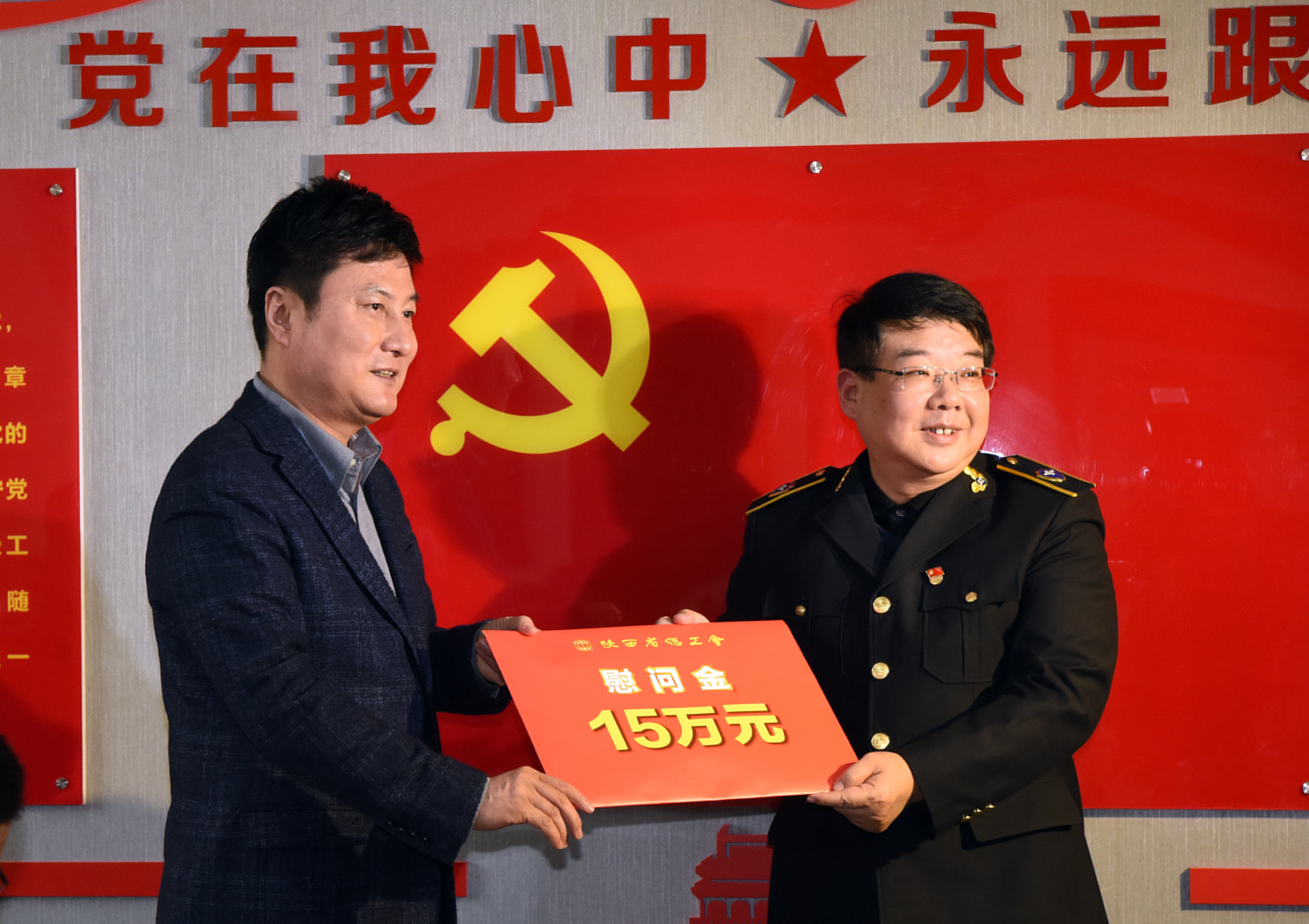 郭大为(左)向西安市公交八公司送去慰问金 (记者 刘强 摄)