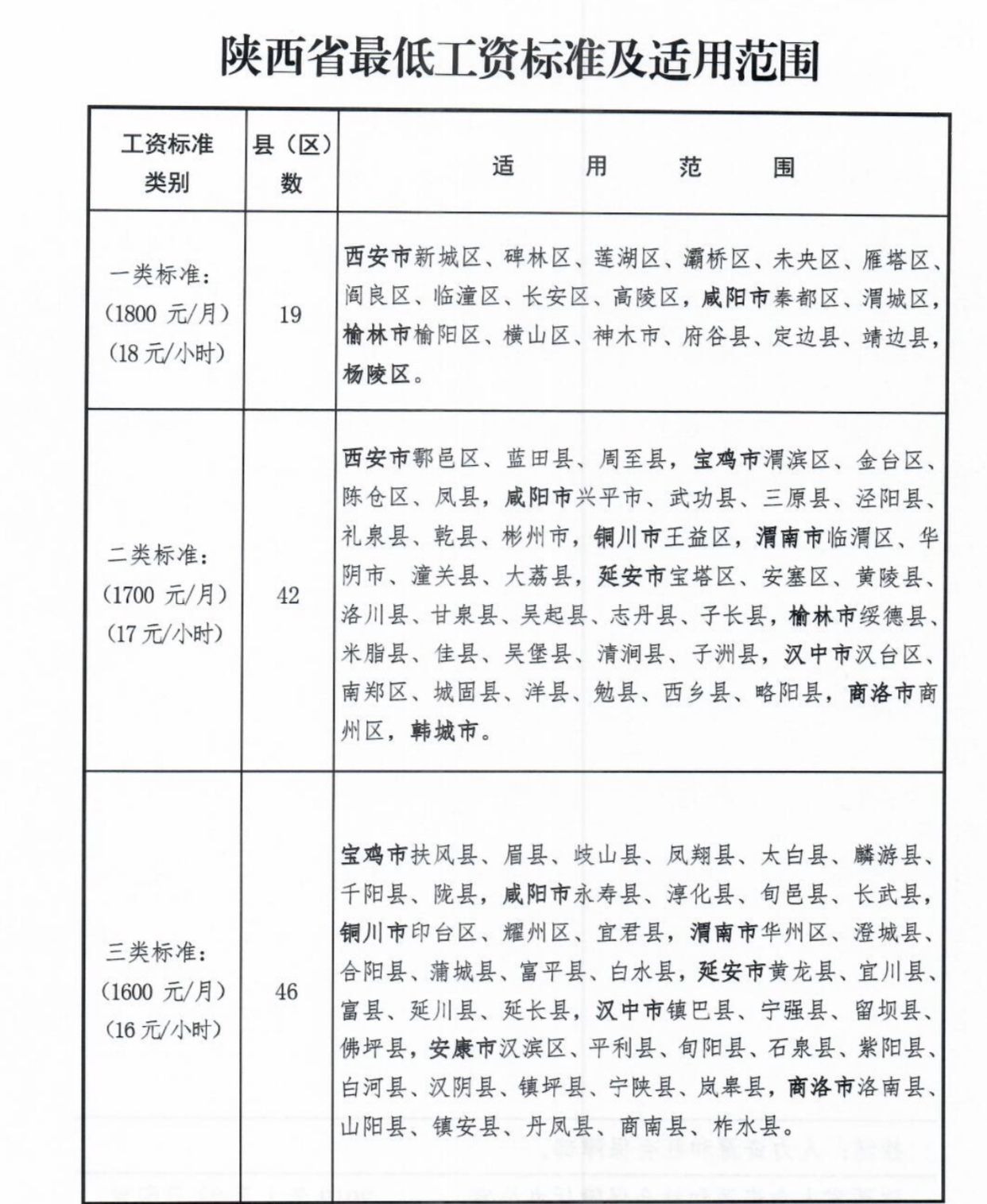 同时最低工资标准地区类别由四类调整为三类,其中:二类区调整到一类区3个:西安市临潼区、长安区、高陵区;三类区调整到二类区8个:西安市鄠邑区、周至县,汉中市城固县、洋县、勉县、西乡县、略阳县,商洛市商州区;四类区调整到二类区1个:西安市蓝田县;四类区调整到三类区20个:宝鸡市麟游县,铜川市宜君县,汉中市镇巴县、宁强县、留坝县、佛坪县,安康市平利县、石泉县、紫阳县、白河县、汉阴县、镇坪县、宁陕县、岚皋县,商洛市洛南县、山阳县、镇安县、丹凤县、商南县、柞水县。