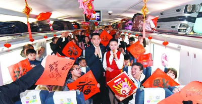 务工者登上车厢的那一刻,车厢里春联、灯笼、鞭炮挂件和福字拉花的布置增添了浓浓的年味。欢迎回家过年的窗花、广播里播放的萨克斯《回家》音乐勾起了乡愁,座位上的福袋、春联、糖果、花生和瓜子礼包更让大家联想到亲人团圆的幸福。
