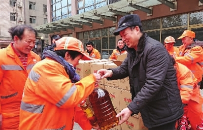 近日,莲湖区总工会对区第二运输公司、西大街道路保洁所、区环卫应急保障中心、桃园路街道办事处四家单位共600名保洁员、驾驶员等一线职工进行慰问,为大家送去了米、面、油等慰问品。王效民代表区总工会对一线职工的辛勤付出表示衷心的感谢,他说:“天冷了,大伙在岗位上忙工作,忙建设,别忘了防寒保暖,照顾好自己,过年都要健健康康,平平安安地回家。”