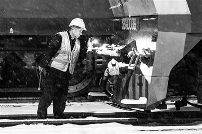 凛冽的寒风和雪片落地的扑簌声之中,夹杂着有规律的“叮叮”声,循声望去,只见机车旁,一个黄蓝相间的身影挪着有节奏的步伐,他手握检查锤逐一仔细敲击着机车几百个大大小小的螺栓,凭借聆听敲击声,就能判断出螺栓是否紧固。此时,他的安全帽上、衣服上都已经积了满满一层雪,而眼神却始终与手电光保持同步,“扫描”着任何可能存在的故障隐患。他叫王陆,今年49岁,从2月9日晚7点接班到现在他检查了第16台机车。