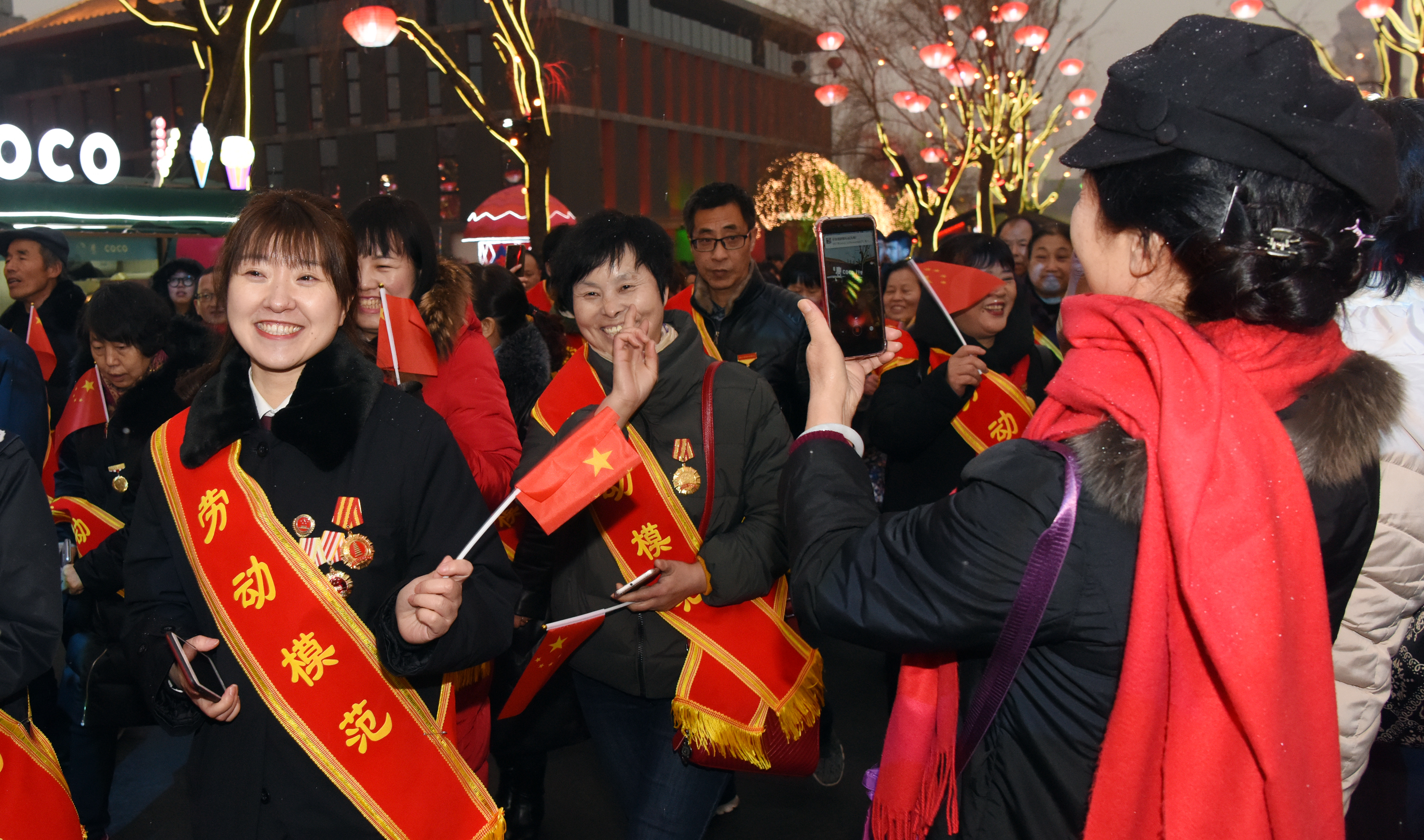 西安盛装迎劳模。作为向全市“最美劳动者”的献礼,此次活动为劳模设置了形式新颖、丰富多彩的观赏游览环节,内容包括:“贺新春慰问劳模”启动仪式、观看文艺演出、游览现代唐人街、观赏大唐芙蓉园景区灯展等。在大唐芙蓉园,208名劳模右手提灯、左手挥舞国旗,站列成“福”字,齐声高呼:“我们都是新时代追梦人,祝福祖国繁荣富强!”