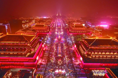 元宵佳节将至,西安旅游市场持续繁荣,部分景区依旧游人如织。这是2月17日拍摄的西安市曲江新区大唐不夜城步行街夜景(无人机拍摄)。邵瑞 摄