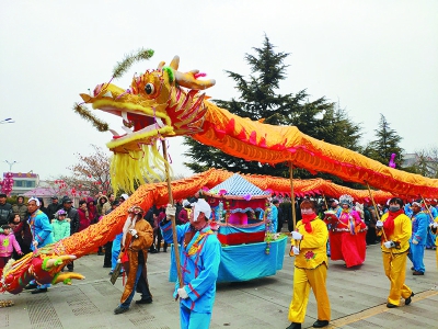 2月17日,千阳县崔家头镇社火队在县城表演“二龙戏珠”,吸引了数千名群众驻足观看。谢红江 摄