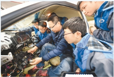 浙江省义乌市国际商贸学校通过与企业合作,高薪聘请相关专业技师来校授课等途径,引进了一批产学合作协同育人项目。图为学生在外聘技师的指导下学习汽车维修技术。