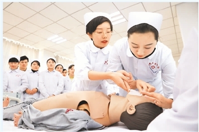 近年来,新疆维吾尔自治区乌苏市建成新疆应用职业技术学院(乌苏校区)、塔城地区乌苏职业技术学校、塔城地区卫生学校3所职业技术院校。2018年3所院校毕业生就业率达95.3%。图为卫生学校教师赵雅楠(前左)向学生教授单人徒手心肺复苏术。