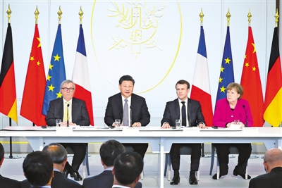 3月26日,国家主席习近平在巴黎同法国总统马克龙一道出席中法全球治理论坛闭幕式。德国总理默克尔、欧盟委员会主席容克应邀出席。 记者 鞠 鹏摄