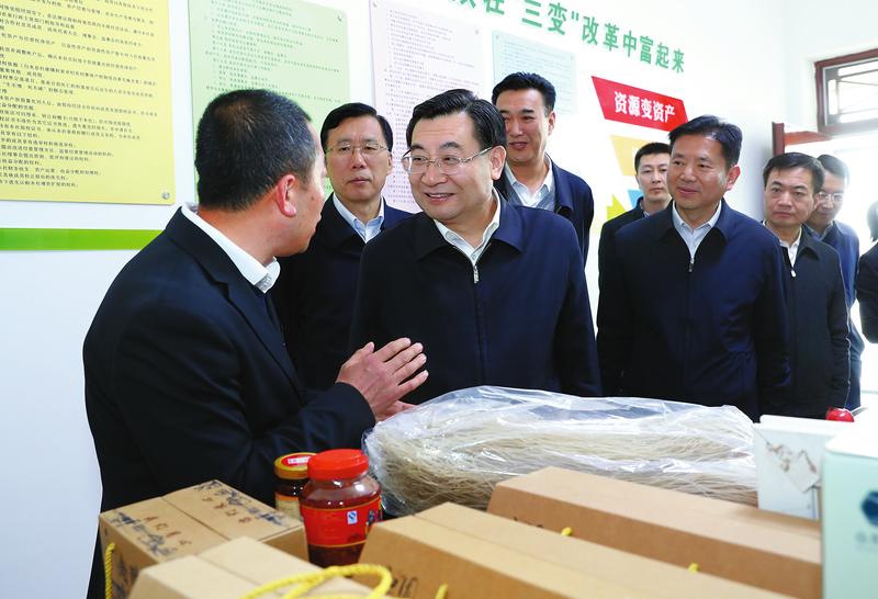 三月二十七日,省委书记胡和平来到白水县杜康镇和家卓村,听取“党支部+村集体经济+园区+贫困户”扶贫介绍,详细了解设施农业发展、田园综合体运行、群众增收等情况。 记者 宋红梅摄
