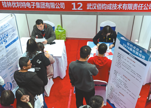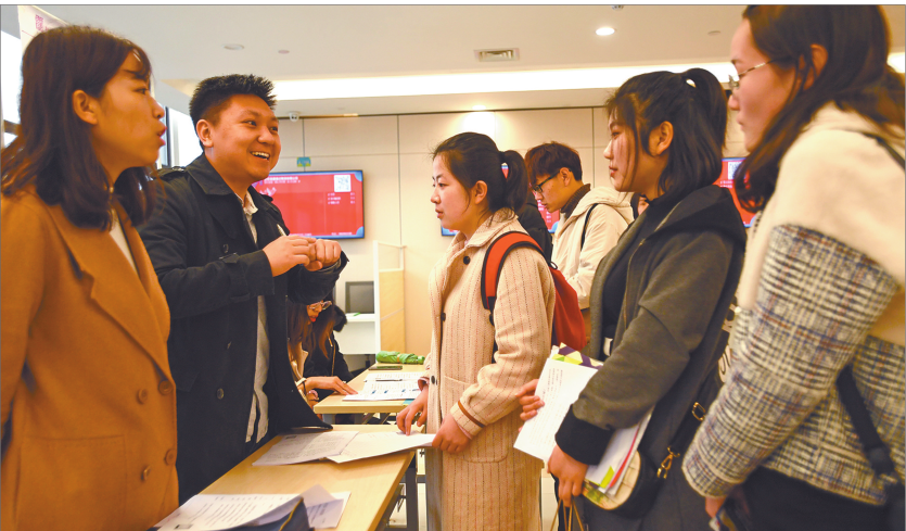 3月10日,在西安电子科技大学2019年春季双选会上,应聘者与用人单位进行洽谈。 记者 袁景智摄