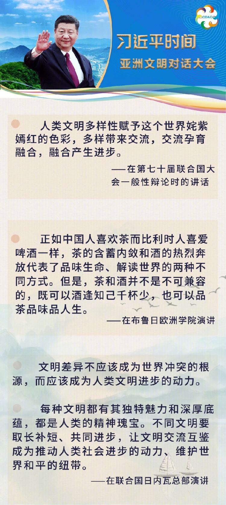 “中方倡议召开亚洲文明对话大会,加强青少年、民间团体、地方、媒体等各界交流,打造智库交流合作网络,让亚洲人民享受更富内涵的精神生活,让地区发展合作更加活力四射。”